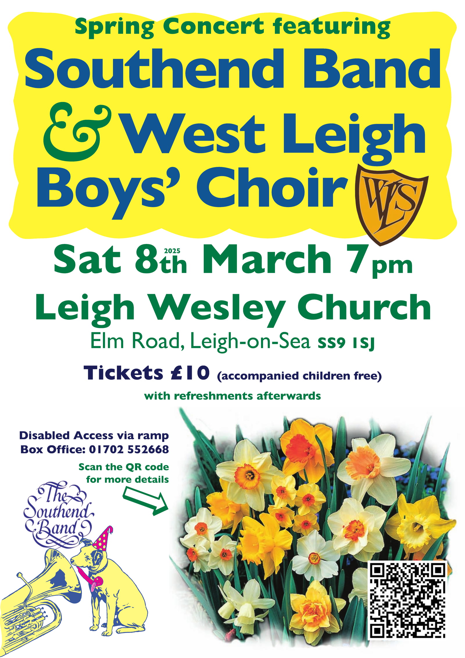 With West Leigh Junior School Boys' ChoirSouthend Band is looking forward to presenting its Spring Concert at Leigh Wesley Methodist Church on Saturday evening, 8th March 2025.